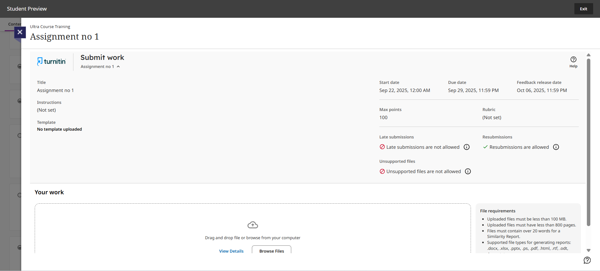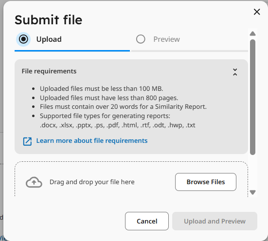 When you enter the Turnitin environment, you can see every detail regarding the assignment (Max Grade, deadline, title, description, file requirements, etc.)